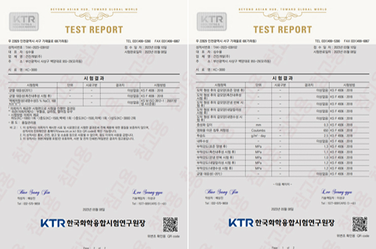 콘크리트 보호용 도막재 품질 기준인 KS F 4936 Full Spec 만족