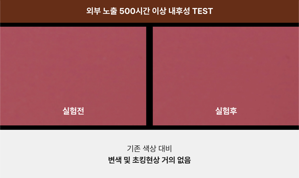 고내후성내후성이 우수한 100% 아크릴 에멀젼 사용으로 도장 초기의 외관을 오래도록 유지 내후성 500시간 이상 (KS M 6010 1종1급 : 300시간)