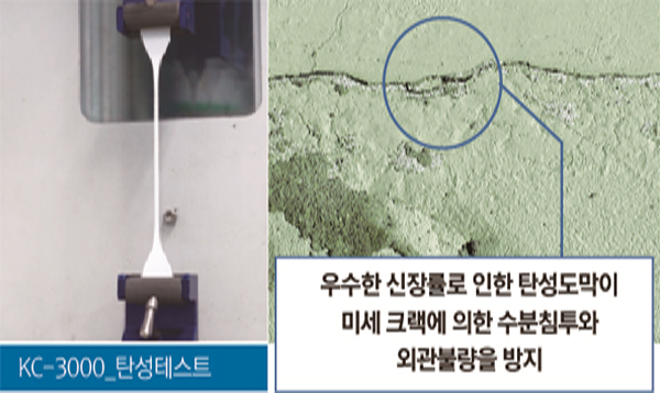 탄성특허 받은 콘크리트 보호 기술이 적용된 탄성 도막을 형성하여, 건축물의 균열(크랙)에 의한 누수 및 외관 불량 현상을 방지(신장율 150%이상)